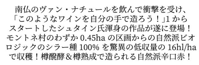 南仏のヴァン・ナチュールを飲んで衝撃を受け、「このようなワインを自分の手で造ろう!」1からスタートしたシュタイン氏渾身の作品が遂に登場!モントネ村のわずか0.45haの区画からの自然派ビオロジックのシラー種100%を驚異の低収量の16hl/haで収穫!樽醗酵&樽熟成で造られる自然派辛口赤!■さまざまなギフトアイテムをご用意しております。お中元 ギフト 御中元 お盆 お礼 敬老の日 クリスマス 冬ギフト お歳暮 御歳暮 お年賀 御年賀 お正月 年末年始 ご挨拶 バレンタイン ホワイトデー お返し 父の日 母の日 ギフト 贈答品 お土産 手土産 御祝 御礼 内祝い 引き出物 お祝い 結婚祝い 結婚内祝い 出産祝い 出産内祝い 引き菓子 快気祝い 快気内祝い 進学祝い 誕生日祝い バースデーケーキ プレゼント Wedding ウェディング ホームパーティ お花見 パーティ 退職ギフト 退職 就任祝い
