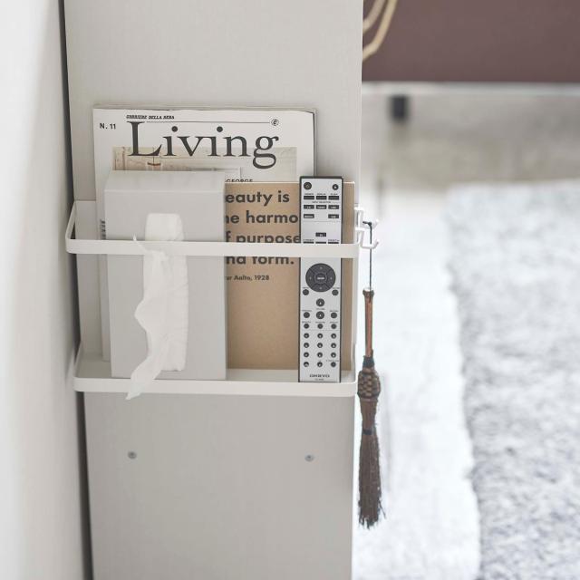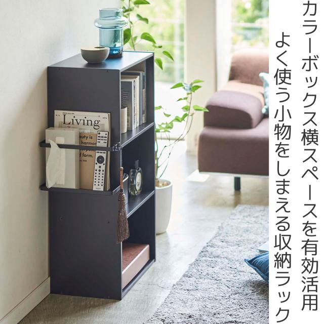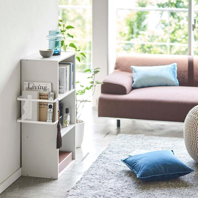 カラーボックス側面の空きスペースを小物の収納として活用できる便利なラックです。定位置がなく散らかりがちなリモコンやティッシュなどもまとめておくことができます。