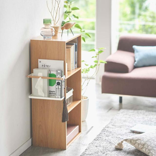 カラーボックス側面の空きスペースを小物の収納として活用できる便利なラックです。定位置がなく散らかりがちなリモコンやティッシュなどもまとめておくことができます。