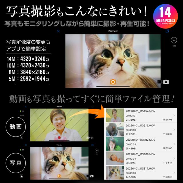 【4】写真もモニタリングしながら簡単に撮影が可能!写真解像度の変更もアプリで簡単設定!