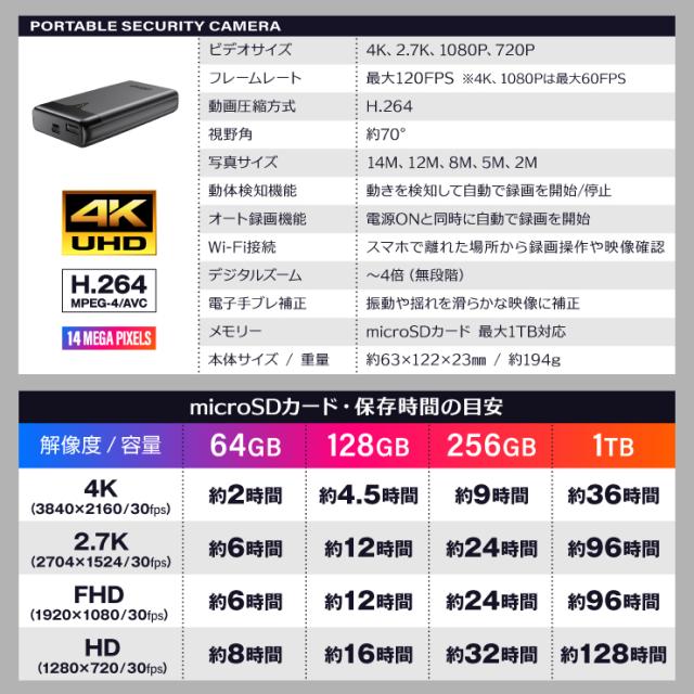 【稼働時間】録画:4K:約20時間、FHD:約40時間