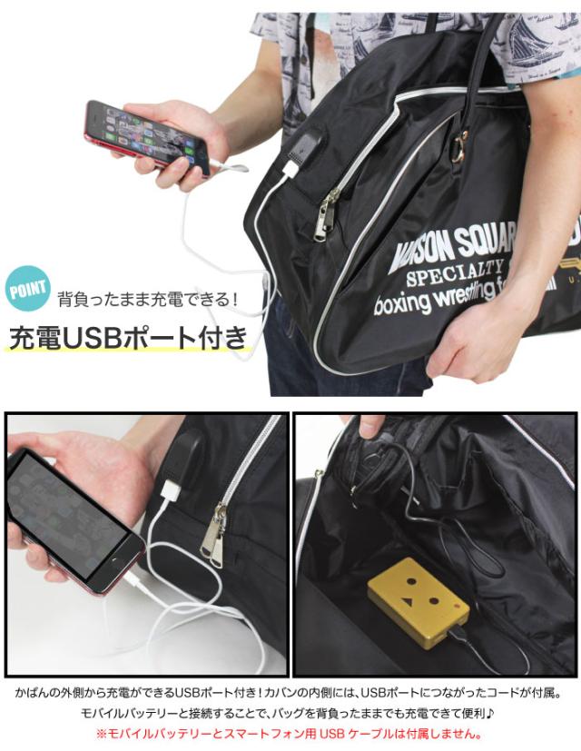外側から充電ができるUSBポート付き!カバンの内側には、USBポートにつながったコードが付属し、