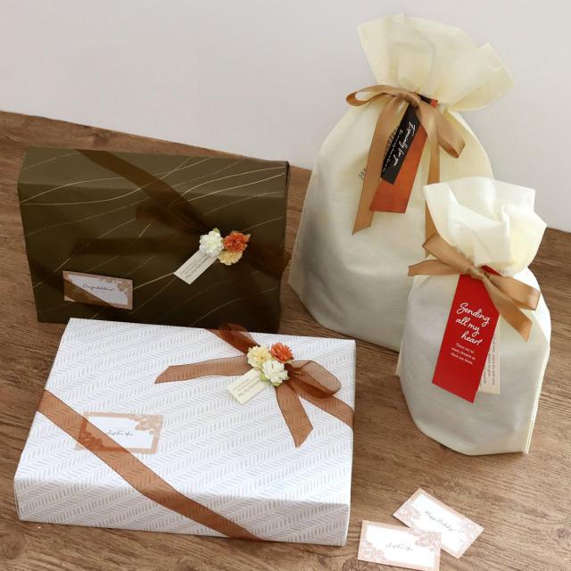 ・リボン、ギフトタグ、造花を付けてお包みします。