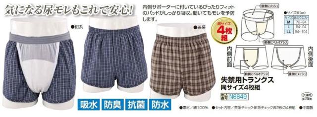 失禁用トランクス(同サイズ4枚組)メンズ 紳士服 シニア 男性 肌着・パンツ チェック柄トランクス 尿漏れ対策 シニアファッション 50代 60代 70代 80代