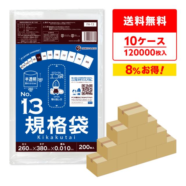 【まとめて10ケース】FA-13-10 規格袋 13号 0.010mm厚 半透明 200枚x60冊x10箱 食品検査適合 RoHS指定 送料無料