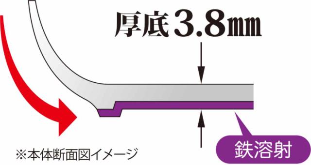 | 材質 | 本体:アルミニウム合金(底厚3.8mm) 底面:鉄・アルミニウム溶射 はり底 持手:フェノール樹脂(キャップ:ステンレス鋼) 表面加工/内面:ふっ素樹脂塗膜加工 外面:焼付け塗装(セラミック塗装) |