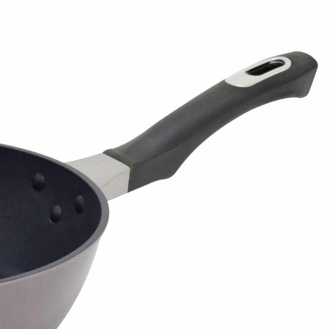 | 材質 | 本体:アルミニウム合金(底厚3.5mm) 底面:鉄・アルミニウム溶射 はり底 持手:フェノール樹脂(キャップ:ステンレス鋼) 表面加工/内面:ふっ素樹脂塗膜加工 外面:焼付け塗装(セラミック塗装) |