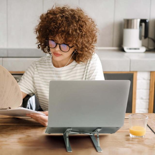 ノートパソコンを快適に使うことができるノートパソコンスタンドです。視線を上げて正しい姿勢を保つことができるので、長時間の作業も快適にこなせます。丈夫なアルミ製で、タイピング中もガタつかず、安定して使用できます。