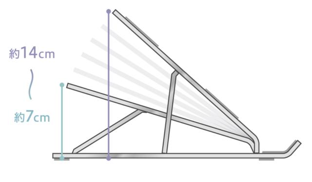 6段階の角度調節で、ノートパソコンの画面を目線に合わせた最適な高さに調節が可能です。最大17インチまでのノートパソコン、タブレットPC、液晶タブレットに対応しています。
