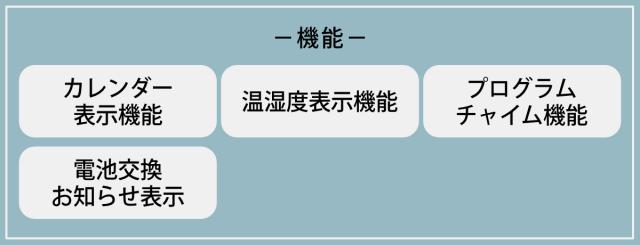 始業/終業時間、朝礼時間、休憩時間など1日のルーティンワークを4回(24時間中)まで設定でき、ウエストミンスターチャイム(キンコンカンコン)で時刻をお知らせします。ご家庭では、薬を飲む時間など毎日決まった時間にアラームを鳴らすことができます。また、電池の残量が少なくなると、電池交換マークを表示し、交換時期をお知らせします。