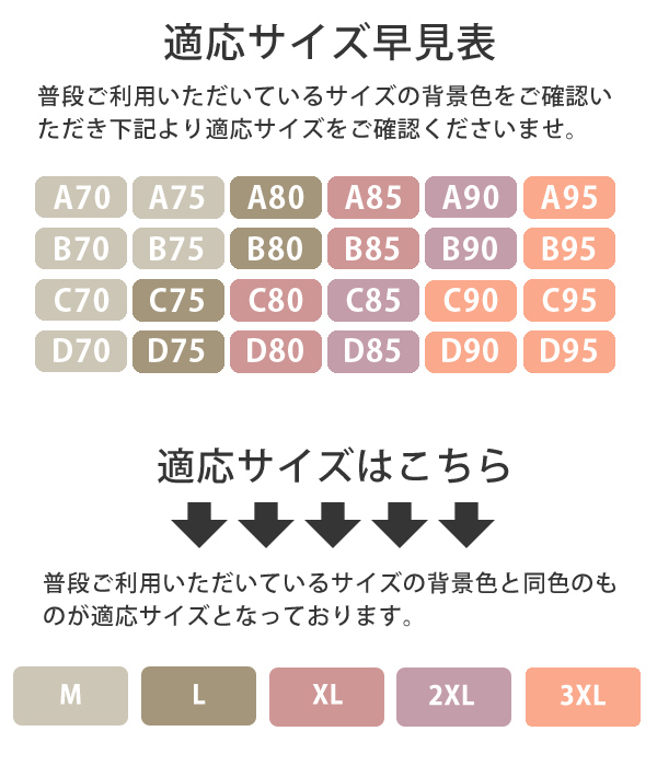 M (A70 B70 C70 D70 A75 B75対応) L (C75 D75 A80 B80対応) XL (C80 D80 A85 B85対応) 2XL (C85 D85 A90 B90対応) 3XL (C90 D90 A95 B95 C95 D95対応) |