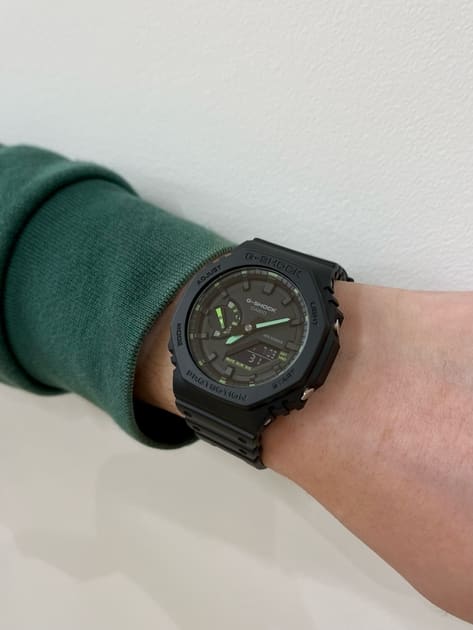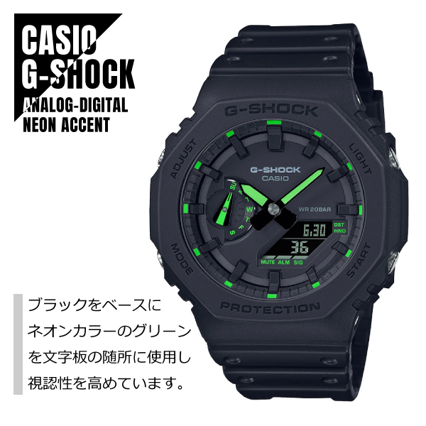 ブラックをベースにネオンカラーのグリーンを文字板の随所に使用し、視認性を高めています。人気のオクタゴンベゼルが特徴的なGA-2100のカラーバリエーションで、クールにまとめました。