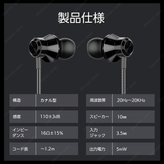 | 【製品仕様】 | 構造:カナル型 スピーカー:10mm ダイナミックドライバー 周波数帯:20Hz 〜 20kHz 感度:110±3dB インピーダンス:16Ω ±15% 入力端子:3.5mm ステレオミニジャック 最大出力:5mW コード長:約1.2m |