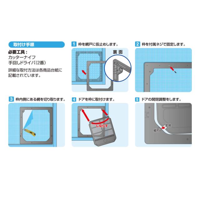 ●ネジで簡単に取付けられる網戸専用のペットドアです。