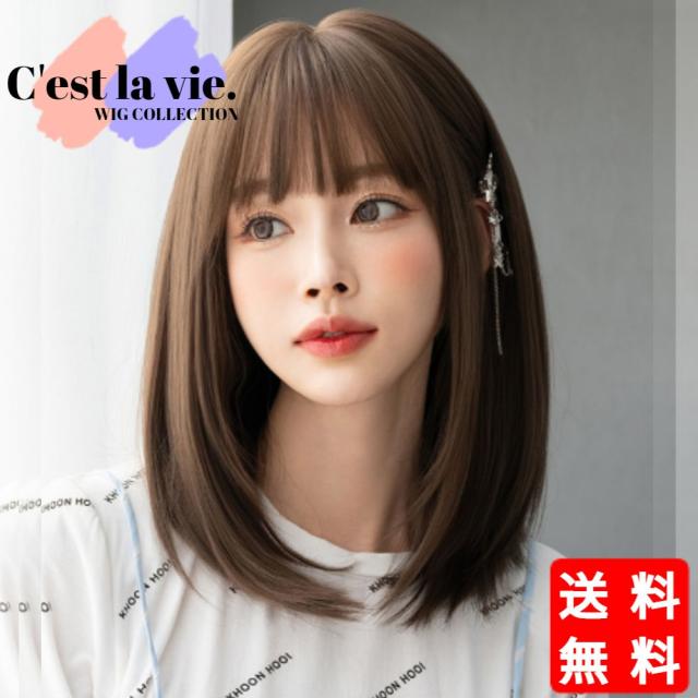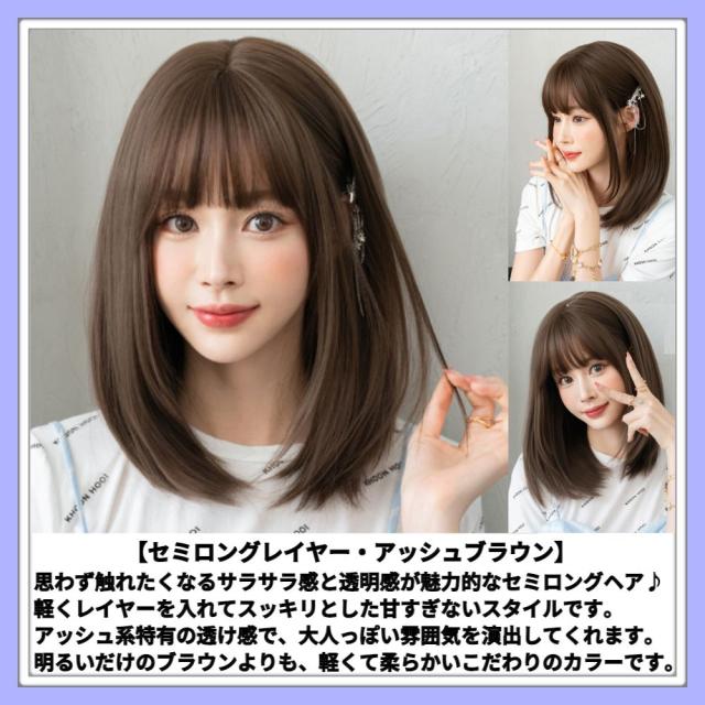 翌日出荷 フルウィッグ セミロング レイヤー アッシュ ブラウン 医療用 かつら ネット付き 自然 小顔