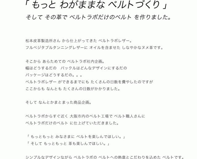 ベルトラボのオリジナルレザーで、ベルトラボのオリジナルベルトを作りたい。そんな思いから試行錯誤を重ね、革をなめすタンナーさん、バックル工場さん、ベルト職人さんに協力してもらい、こだわりぬいて作りました。