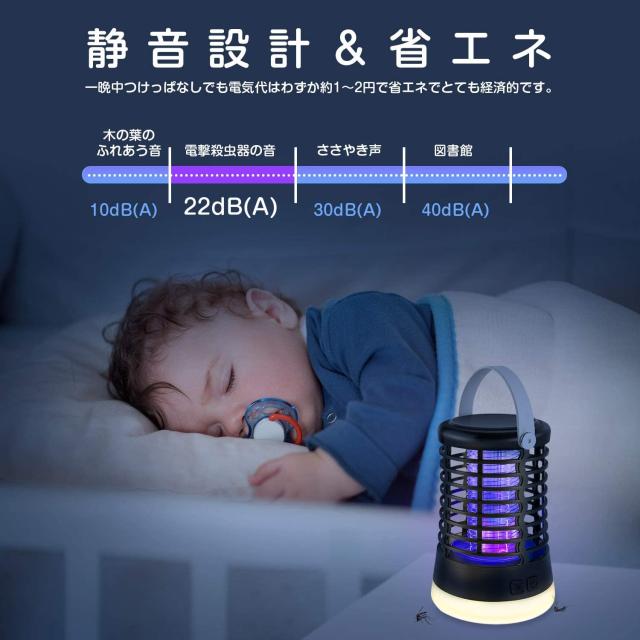 【虫除け効果倍増・安全無害】接触した虫類に高電圧で瞬間時に殺虫できる電撃殺虫器です。UV紫光ランプの灯玉を採用して、周囲に360