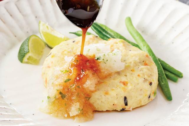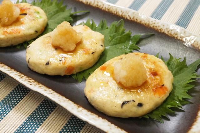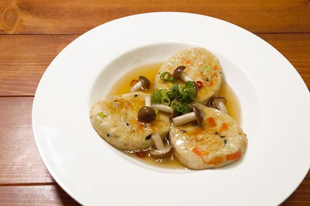 原材料名:豆腐(国内製造)、鶏肉、植物油脂、人参、魚肉すり身、えだ豆、パン粉、粉末状植物性たん白、れんこん水煮、おろしにんにく、がらスープの素、食塩、澱粉、還元澱粉加水分解物、コショウ、しょうゆ、ひじき、かつおエキス調味料、ローストオニオンパウダー/調味料(アミノ酸等)、グリシン、保存料(しらこたん白)、甘味料(スクラロース)、(一部に小麦・ごま・さけ・さば・大豆・鶏肉・豚肉を含む)