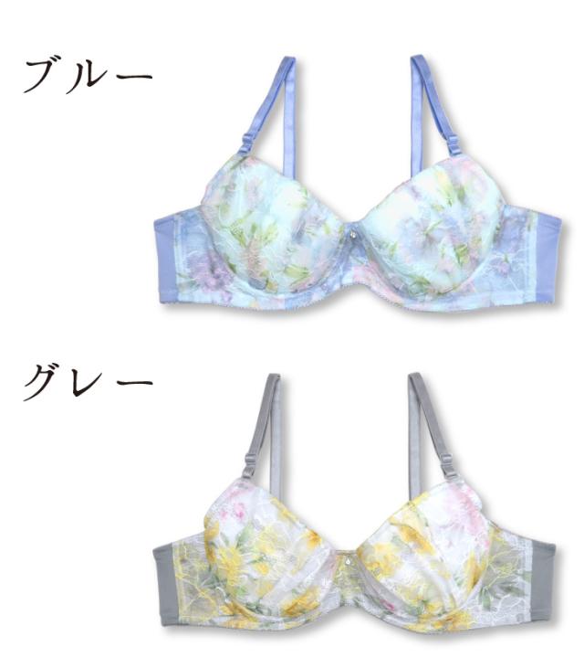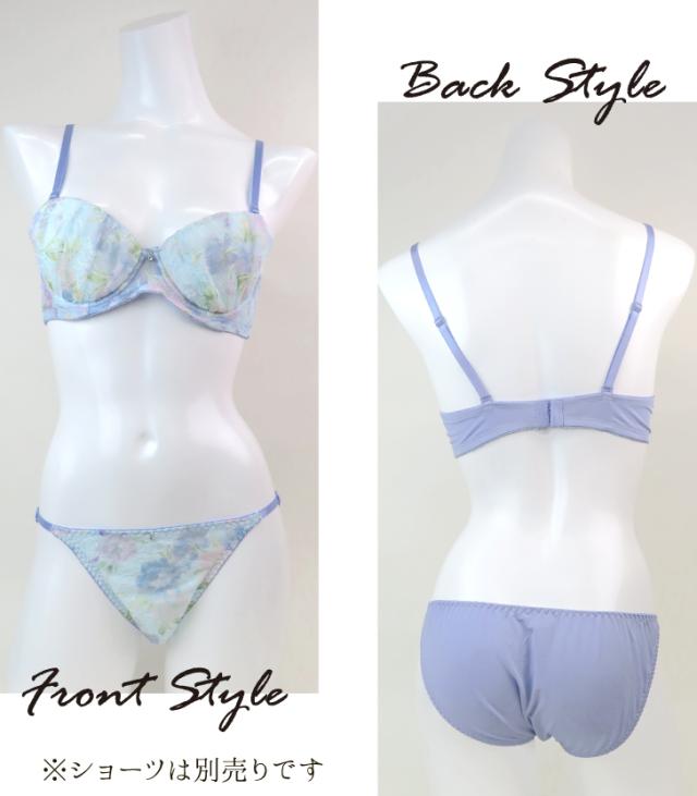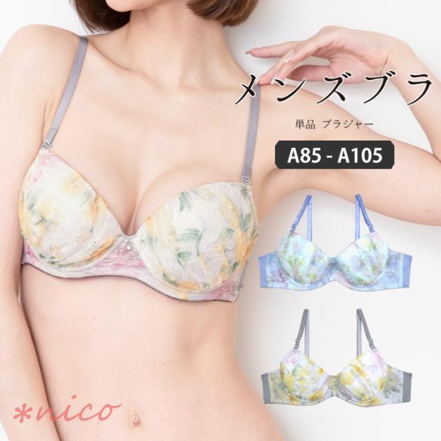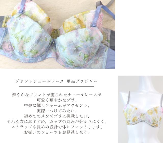 鮮やかなプリントが施されたチュールレースが可愛く華やかなブラ。中央に輝くチャームがアクセント。実際につけてみたい、初めてのメンズブラに挑戦したい、そんな方におすすめ。カップの丸みが分かりにくく、ストラップも長めの設計で体にフィットします。お揃いのショーツもお見逃しなく。