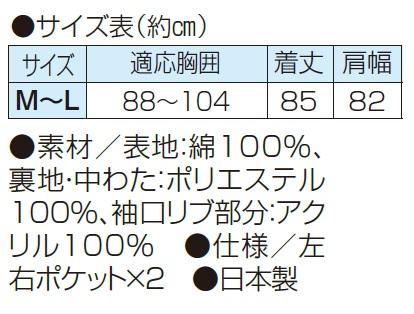 ●素材/表地:綿100%、裏地・中わた:ポリエステル100%、袖口リブ部分:アクリル100%