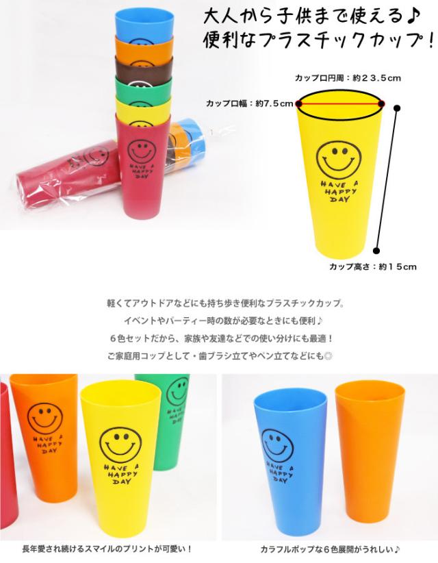 スマイル カラフル プラスチックカップ【6色セット】