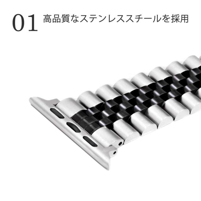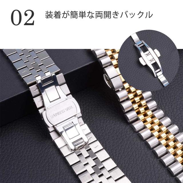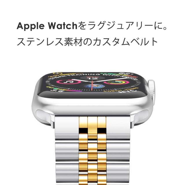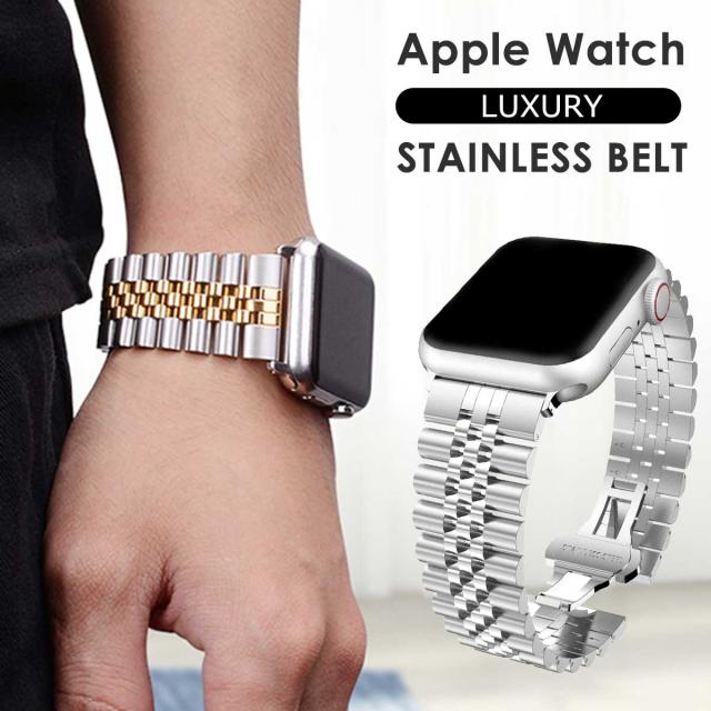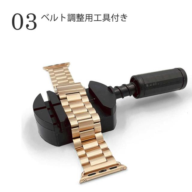 Apple Watchの着せ替えバンドから高品質でラグジュアリーなステンレス製の3連ベルトが登場です。 無垢コマを使用しており,重量感のある仕上がりです。 きちっとした印象で、スーツにも私服にも合わせやすいのが特徴です。 またステンレス製なので重量感があり、キズが付きやすいのが注意点ですが レザーとは違いキズは研磨クロスなどで磨いてメンテできます。 汗や水が付着してもクロスで拭き手入れを欠かさなければ、レザーのように 痛んでくることはありません。 またアップルウォッチ用のラグも付いていて、ベルト調整用の工具もセットになっています。 商品が届いてスグにベルト調整が出来るので時計店に持ち込んで ベルト調整をする必要もありません。