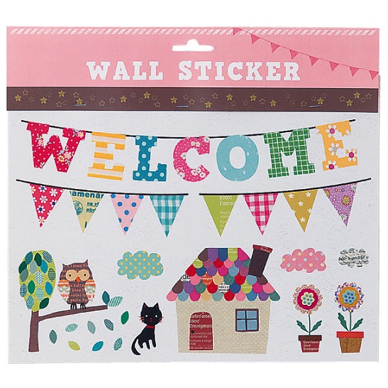 ウォールステッカー ウェルカム 三角旗 はがせる 壁シール かわいい 家 黒猫 フクロウ 木 鉢植えの花 歓迎 ドア 玄関 賃貸部屋 送料無料