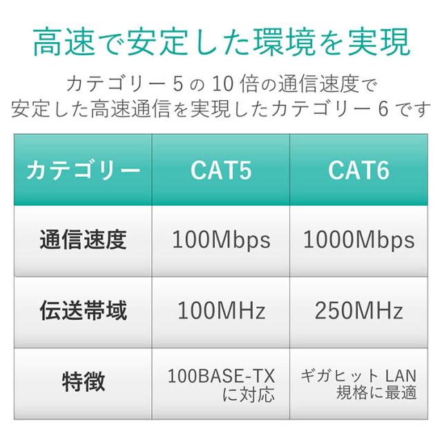 幅約6mm、厚さ約1.38mmのスーパーフラットタイプケーブルを採用した1ギガビット対応のCAT6準拠ケーブルです。■カラー:ブルー ■伝送速度:1Gbps ■インターフェイス:RJ-45コネクター ■環境配慮事項:EU RoHS指令準拠(10物質) ■規格:Cat6準拠(1000BASE-TX/1000BASE-T/100BASE-TX/10BASE-Tに準拠) ■伝送帯域:250MHz ■ケーブル長:5.0m ■結線方式:ストレート結線 ■ヨリ対芯線(ツイストペアケーブル):○ ■シールド:無し(UTP仕様) ■外部シース(被膜)材質:PVC ■導体構成:ヨリ線(32AWG) ■コネクタ有無:両端コネクター付 ■スリムコネクタ:○ ■爪折れ防止カバー付コネクタ:○ ■パッケージ形態:アルミ箔袋+ステッカー ■ケーブル太さ:1.38mm ■芯数:8芯 ■モールド加工コネクタ:○