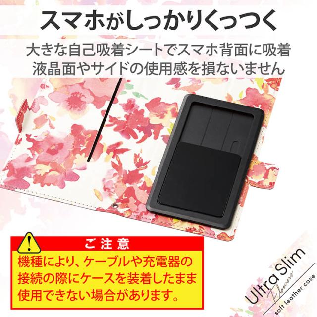 スマートフォンがピタッとくっつく自己吸着シートを採用し、機種を選ばず使用できる、ケース内側に愛らしいフラワープリントを施した薄型・軽量タイプの手帳型マルチカバー。■参考収納寸法:幅約70〜80mm×奥行約12mm×高さ約150〜170mm ■セット内容:ケース本体×1 ■材質:本体:合成皮革、ABS、ポリウレタン ■カラー:ディープピンク