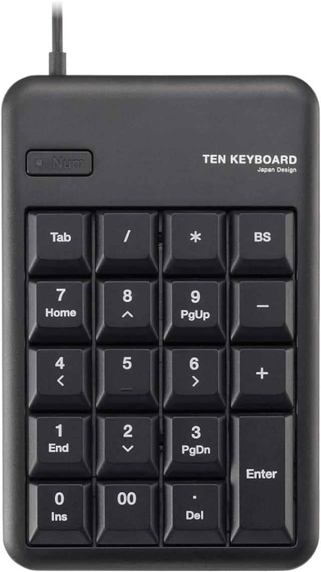 EU RoHS指令準拠(10物質)し、環境に配慮したパッケージを採用。Excelに便利な[Tab]キー付きで、ノートパソコンでの使用に最適なスタンダードUSBテンキーボード。■インターフェイス:USB ■コネクタ形状:USB[A] ■対応機種:USBポートを装備したWindows OS搭載機 ■対応OS:Windows 11、Windows 10、Windows 8〜8.1、Windows RT〜RT8.1、Windows 7(SP1)、Windows Vista(SP2)、Windows XP(SP3) ■カラー:ブラック ■キータイプ:メンブレン ■キー配列:20キー ■キーピッチ:19mm ■キーストローク:2.3mm ■電源方式:USBバスパワー ■ケーブル長:0.5m ■外形寸法:幅90×奥行140×高さ23.5mm(ケーブル除く) ■質量:約110g ■保証期間:6カ月 ■VCCI classB対応:○