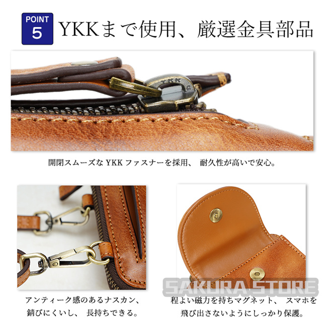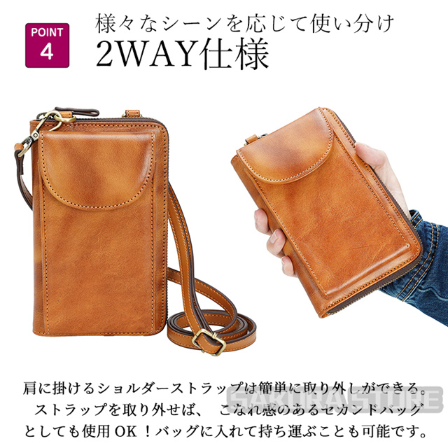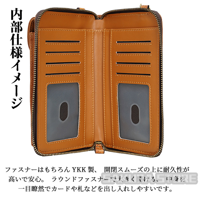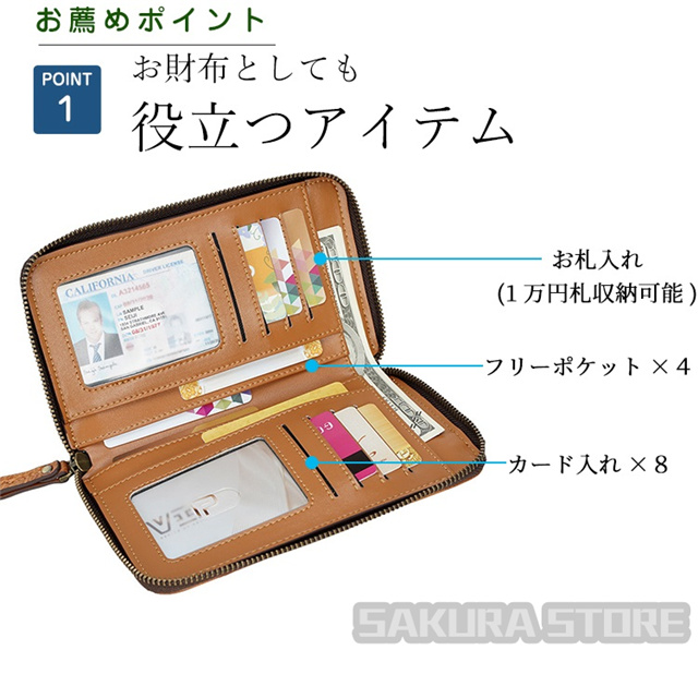 - カード、現金、小銭の入れ用の長財布として肩から掛けて、手ぶらで出かけられるので便利です。出し入れしやすい