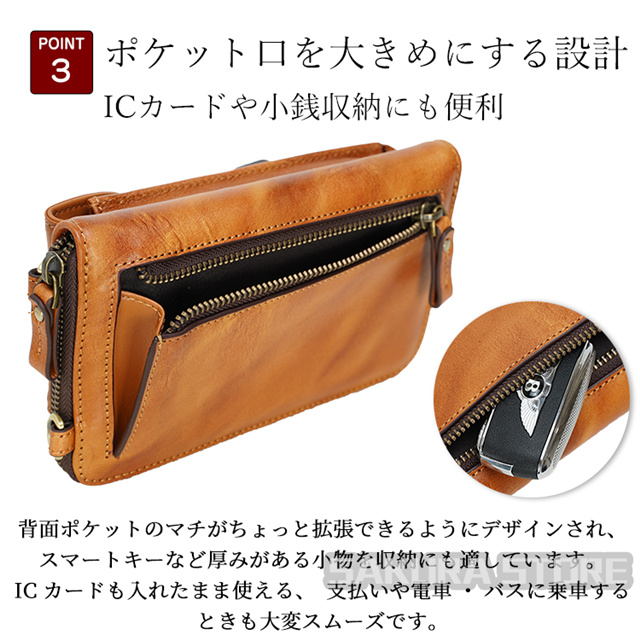 ICカードや小銭収納にも便利 背面ポケットのマチがちょっと拡張できるようにデザインされ、 スマートキーなど厚みがある小物を収納にも適しています。 ICカードも入れたまま使える、支払いや電車・バスに乗車する ときも大変スムーズです。