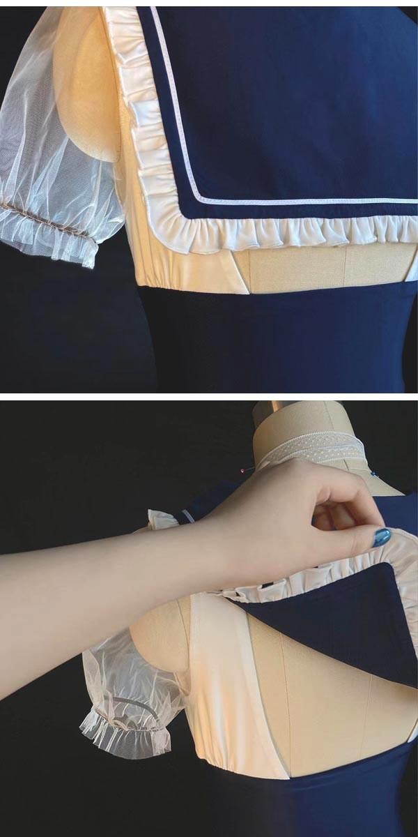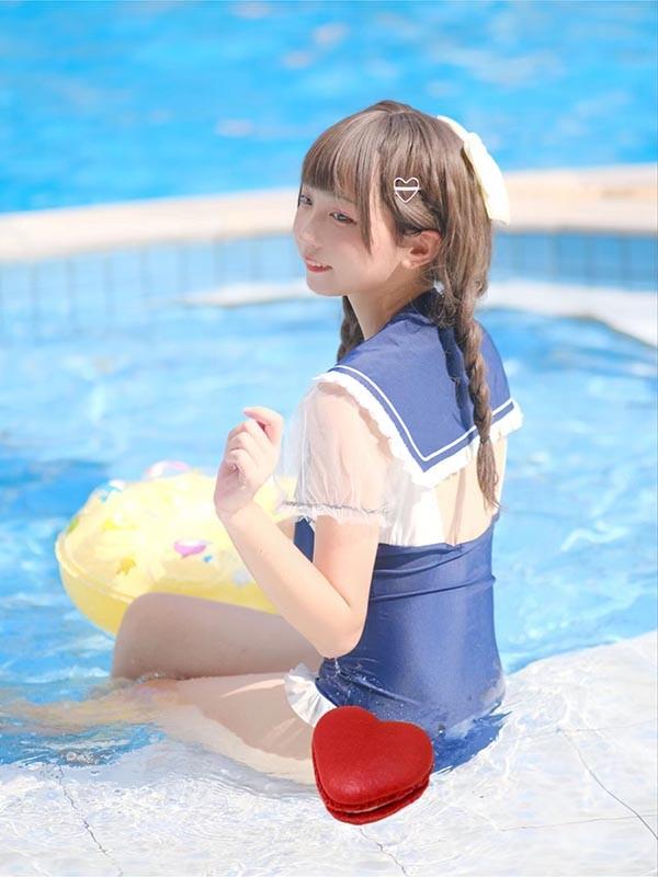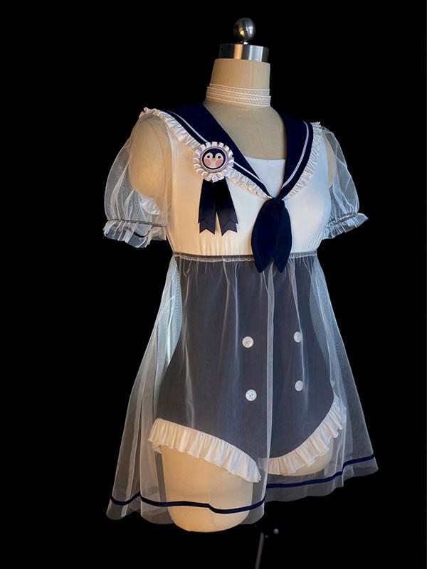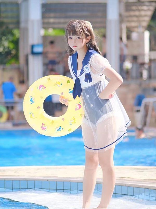 ワンピース水着 レディース マリン風 セーラー服 かわいい フリル 透明感あり リボン 水着 着?せ 学生水着 撮影 温泉 プール ビーチ ネイビー ホワイト S M L 2L ec102t2t2la