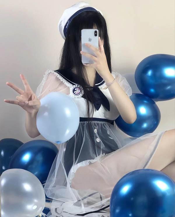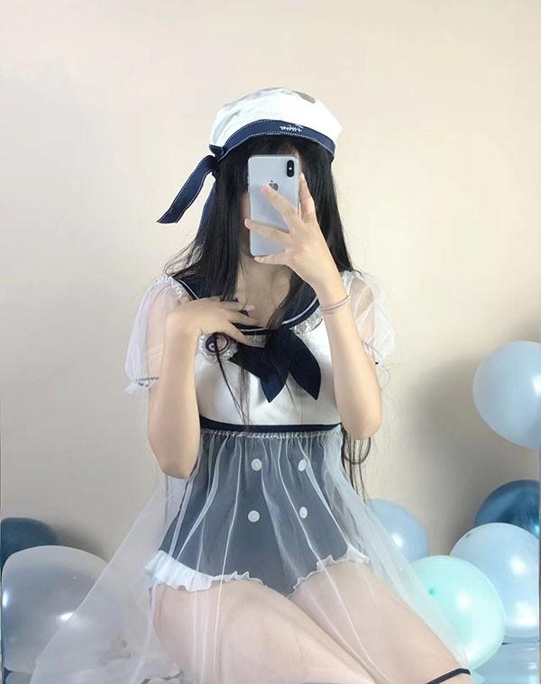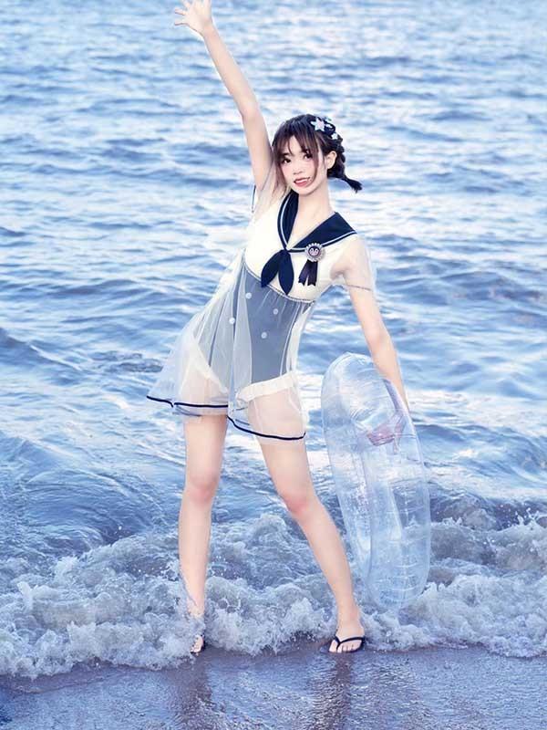 【レビュー投稿で+5%還元】ワンピース水着 レディース マリン風 セーラー服 かわいい フリル 透明感あり リボン 水着 着痩せ 学生水着 撮影 温泉 プール ビーチ ネイビー ホワイト S M L 2L