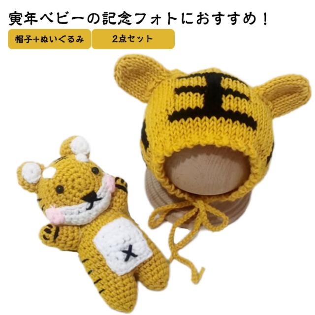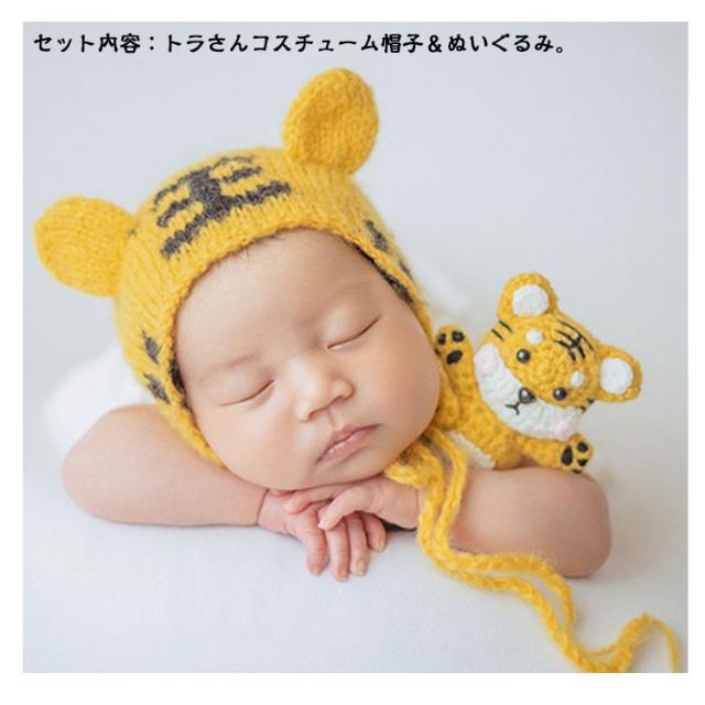 月齢フォト ニューボーン フォト ベビー 虎 寅年 帽子+ぬいぐるみ 2点セット ニット 男の子 女の子 寝相アート イエロー 衣裳 仮装 コスチューム 写真撮影 記念写真 記念撮影 ギフト 出産祝い 年賀状作り