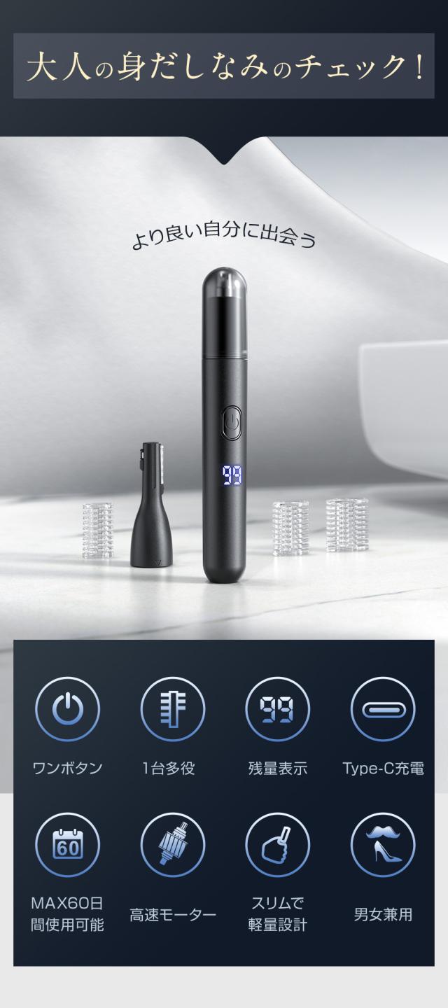 鼻毛カッター エチケットカッター 眉毛トリマー 1台多役 男女兼用 USB充電 Type-C 残量表示 ワンボタン操作 スリムデザイン