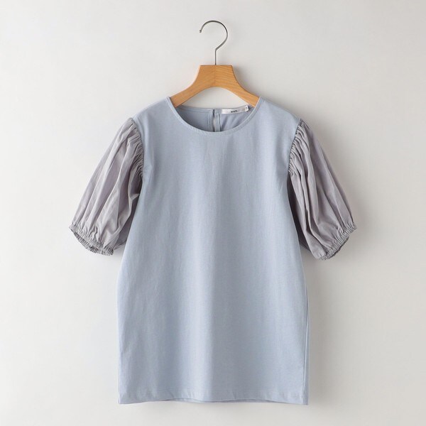 一枚でおしゃれに決まる女の子らしさ満載のデザインカットソー。\nさらりとした肌触りの良い天竺と、ボリューム感を押さえたやや長めのパフスリーブで、きれいめに仕上げました。\n袖口のゴム部分はゆとりがあるので、通気性も良く、盛夏にもストレスフリーな仕様になっております。\nさらに、ボートネック気味に開けた襟ぐりは、裏バインダー始末でスッキリと仕上げるなど、細部にもこだわった一枚。\nセンターバックに施した釦もキラリと光るさりげないアクセント♪\nニュアンスカラーのバリエーションは、夏はもちろん、秋口にも馴染む万能アイテムです!\nパンツやキュロットと合わせてカジュアルに普段使いも、スカートと合わせて上品にまとめたお出かけコーデにもおすすめです。