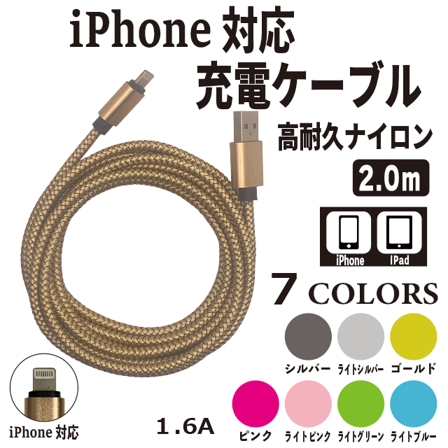 【 3本購入で+1本プレゼント! 】 iPhone 対応 充電 ケーブル 2m ナイロン 【 商品レビュー記入でポイント10%還元 】