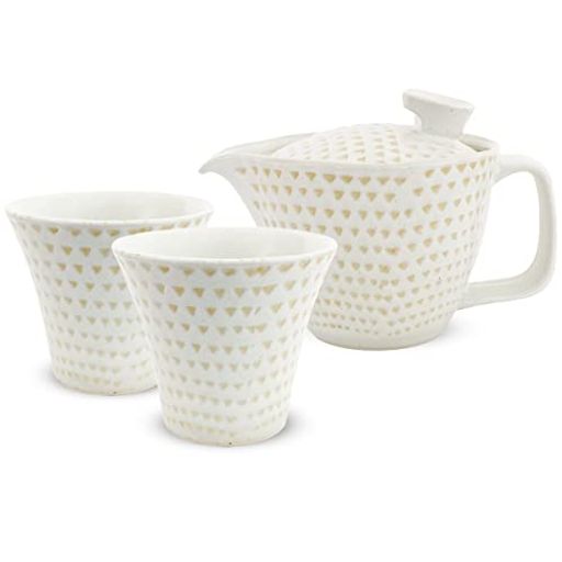 おしゃれな器で有名な波佐見焼のポット型急須とカップ2個のセット。ポットは、本体底面すれすれまで深さがあるステンレス製の茶こし付きなので少量でも美味しいお茶を楽しめます。又、片手でも注ぎやすいように蓋のつまみの位置を工夫しました。蓋の置き場に困らないように渕に掛けることが出来るように工夫してみました。