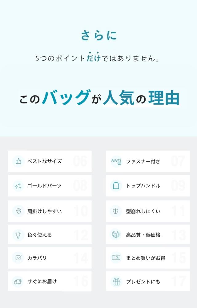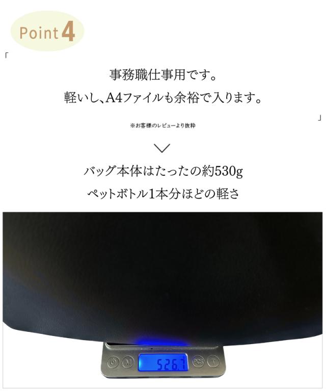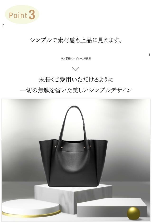 ・とにかく大容量でたくさん収納できる ・大きく開くので中身が見やすい ・A4サイズの雑誌や書類も楽々入る ・高級感のあるPUレザーを使用 ・上品なゴールドファスナー(ジッパー) ・手提げも肩掛けもできるちょうど良い持ち手 ・バッグの重さはわずか500gの超軽量 ・負担のかかる持ち手には金具補強入り ・合わせやすいシンプルなデザイン ・お好みで選べる4色展開 ・細部の縫製も丁寧だから丈夫で長持ち ・通勤(ビジネス用)、通学(学校用)にも大活躍 ・他にもショッピングやデート、1泊旅行(トラベル)等におすすめ ・30日間の長期製品保証 ・気に入らなければ返品OK |