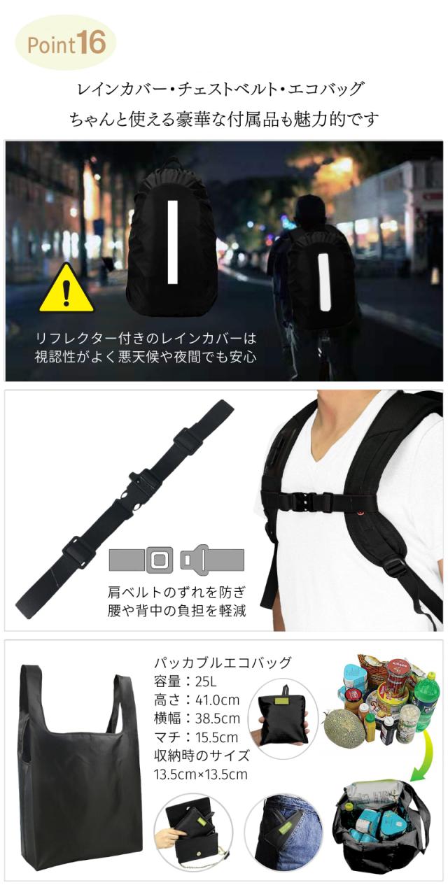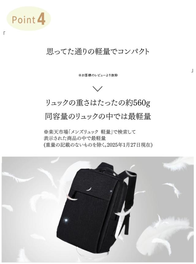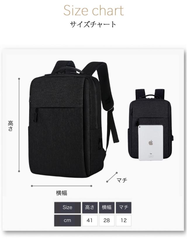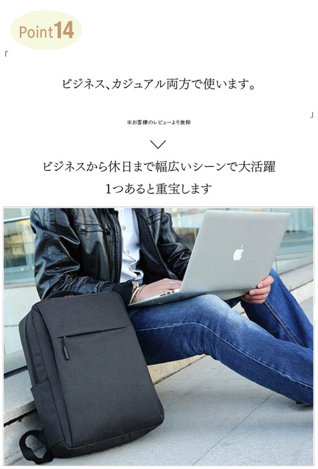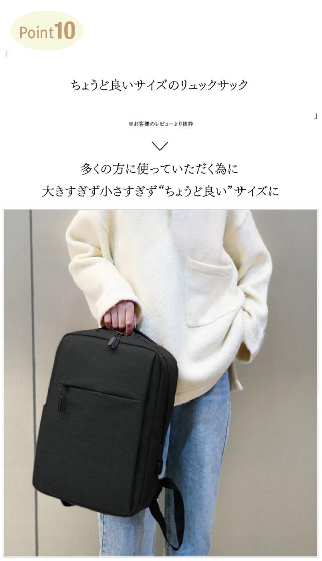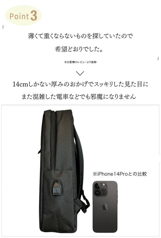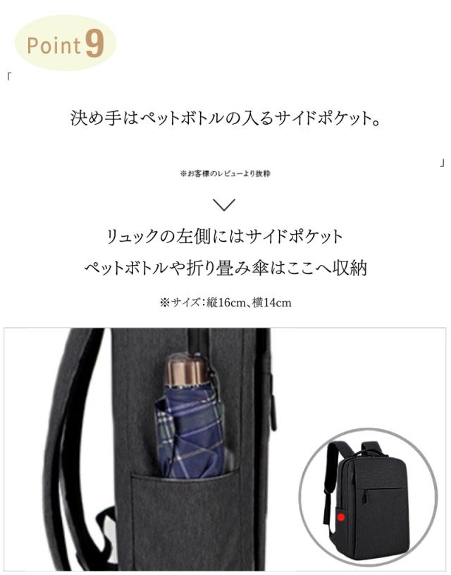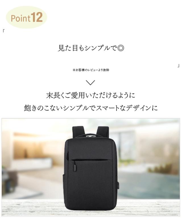 ・A4もらくらく入る大容量 ・大きく開くので中身が見やすい ・スマホや小物を収納できるフロントポケット小 ・タブレットや雑誌を収納できるフロントポケット大 ・ペットボトルや折畳み傘用、サイドポケット ・撥水加工なので汚れにくく手入れもしやすい ・傷つきにくい素材を使用 ・USBポート搭載でスマホを使いながら充電OK ・肩ベルトはクッション性◎で疲れにくい ・560gと超軽量設計で軽い ・耐久性のあるファスナーは壊れにくい ・細部の縫製も丁寧だから丈夫で長持ち ・持ち手もしっかりした素材で破れにくい ・iPadやタブレット、PCも余裕で入る ・通勤(ビジネス用)、通学(学校用)にも大活躍 ・30日間の長期製品保証 ・気に入らなければ返品OK |