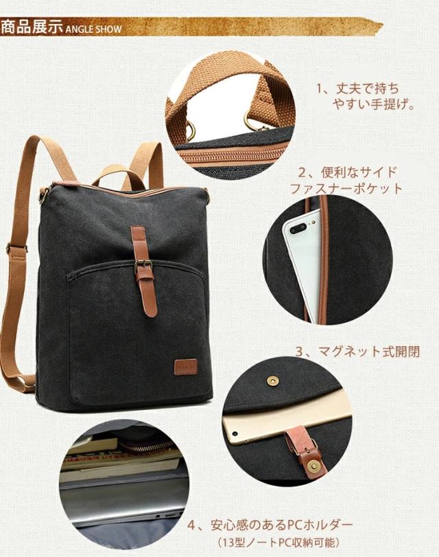 カラー:帆布・黒/帆布・灰 重量:0.62Kg 素材:キャンバス サイズ:36CM*11CM*36CM 容量:PC13.3寸対応可能 PCホルダーサイズ:29CM*29CM