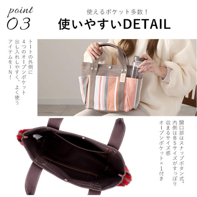| 商品説明 | ・普段使いにぴったり!使い勝手の良い4ポケット付きのトート(Sサイズ)が発売。 「LES TOILES DU SOLEIL(レ・トワール・デュ・ソレイユ)」は、フランス最南端の村「サン・ロラン・デュ・セルダン」で生まれたブランド。 ・カラフルなストライプを基調としたテキスタイル♪独特の鮮やかな色彩が魅力。 ・キャンバス生地で作られたバッグは厚手で丈夫!持ち手部分には使い込むほどに味わいを増す牛革を使用。 ・開口部はスナップボタン式。内側はB5サイズがすっぽり収まるサイズ感で、オープンポケット×1付き。 ・トートの外側に4つのオープンポケットを配置しており、小物の整理整頓がラクチン。 ・コーデのアクセントになるカラーバリエーション! |