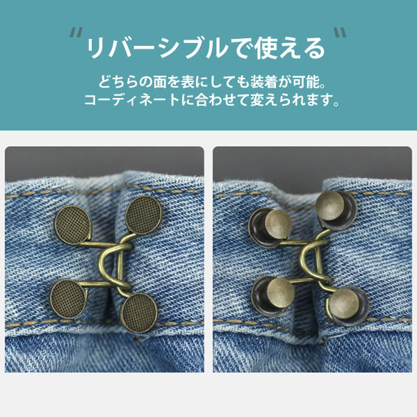 フックとアイセットは使いやすく、どんなパンツにも効果的なウエストエクステンダーです。ウエストが少し大きくてずれ落ちてしまうジーンズやスカートに使えるので便利。ベルトの代わりに使用することができます。