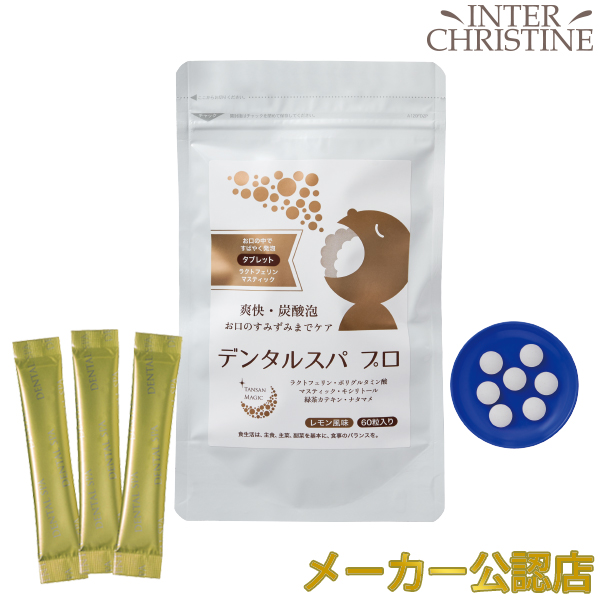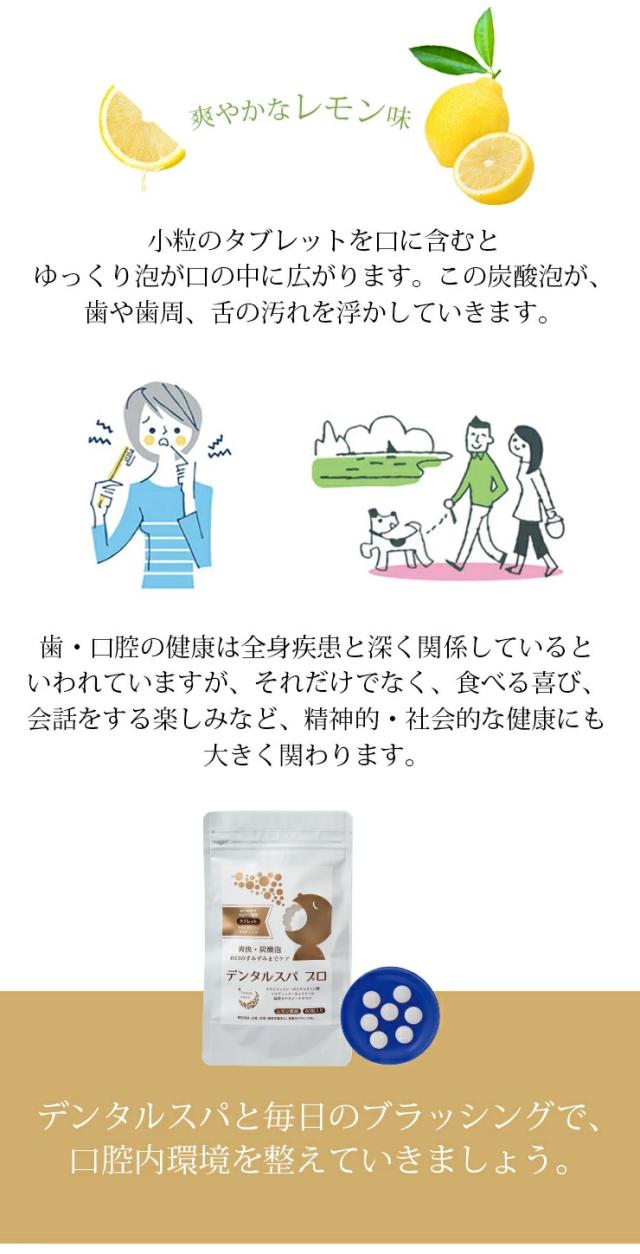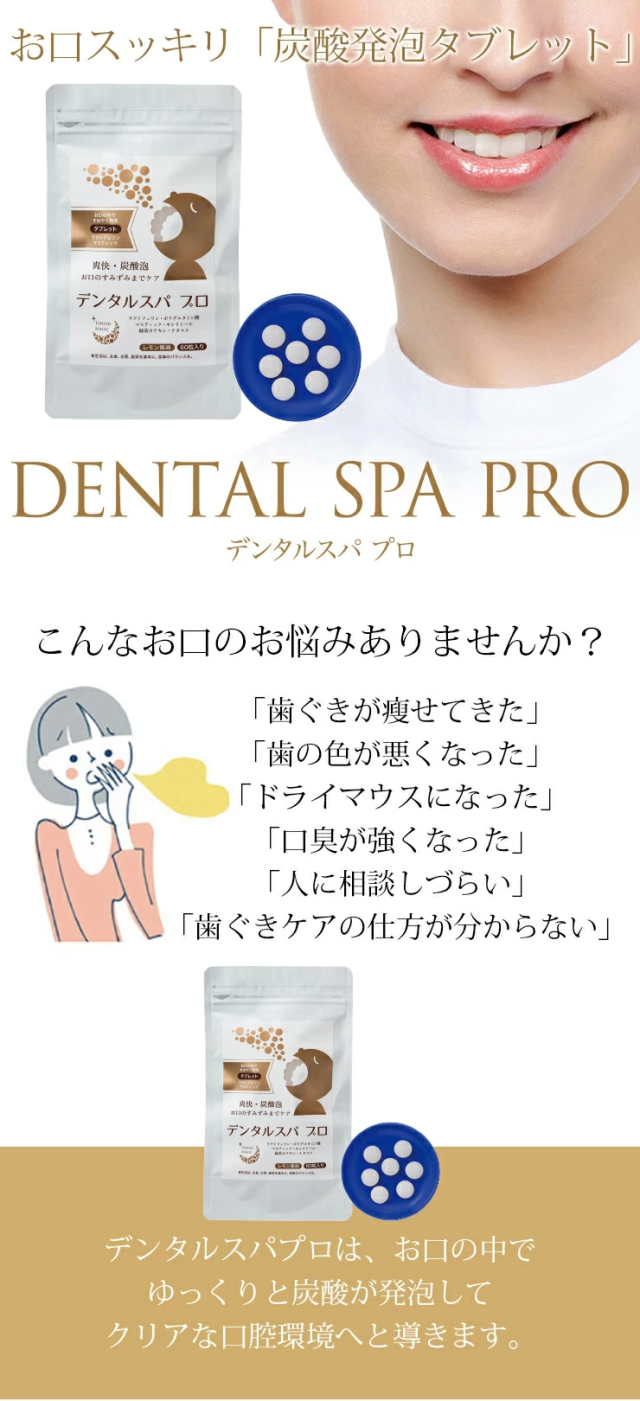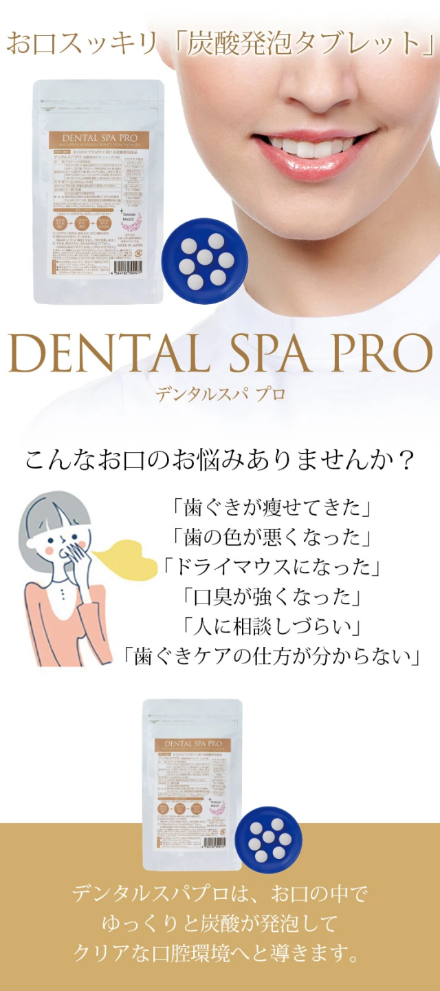 東洋炭酸研究所 デンタルスパプロ 60粒 ×2袋セット <2025年7月にリニューアルしました> ・緑茶カテキン、ナタマメエキスを増量 お口の中ですばやく溶けてお口の中をきれいにする炭酸発泡タブレット。顆粒タイプが苦手な方、一度に発泡せず、ゆっくり発泡してほしい方におすすめのタブレットタイプです。お子様や女性に好評。デンタルクリニック専用販売品がこのたび一般販売となりました。 <デンタルスパプロ(タブレット)とデンタルスパ(顆粒タイプ)との違い> 「デンタルスパプロ」は、「デンタルスパ」に比べ、口腔内環境を整える成分が追加されています。また豊富な栄養素が含まれ、スーパーフードとも呼ばれるローヤルゼリーを配合。「デンタルスパ」(顆粒タイプ)の製品がお召し上がりにくいと感じた方や、毎日の食生活で栄養不足を心配される方は、「デンタルスパプロ」(タブレットタイプ)をお試しいただき、美容と健康にお役立てください。 お口専用「炭酸パック」。炭酸発泡タブレットがお口の中で弾けて、クリアな口腔環境へと導きます。多くの人が歯周病や口臭に悩んでいます。ブラッシングの前にデンタルスパプロを併用することで、歯ブラシの届きにくい歯間に炭酸泡が行き届き、汚れを浮かし、ブラッシングによる効果をより高めることができます。汚れが付きやすい歯や歯ぐき、舌など、お口の中をキレイにし、健康的な口腔環境を整えましょう。 お口に1粒含むと、発泡し始め、炭酸泡が口の中に広がります。この泡が歯や歯周、舌の汚れを浮かしていきます。歯・口腔の健康は、全身疾患と深く関係しているといわれていますが、それだけでなく、食べる喜び、会話をする楽しみなど、精神的、社会的な健康にも大きく関わります。デンタルスパと毎日のブラッシングで、口腔環境を整えていきましょう。 <口腔に関するお悩みを大別すると6つに集中> ・歯ぐきが痩せてきた ・歯の色が悪くなった ・ドライマウスになった ・口臭が強くなった ・人に相談しづらい ・歯ぐきケアの仕方が分からない ※七星出版「プラチナーデ」編集部調べ <こんな時におすすめ> ・朝起きて、朝食の前に ・歯みがきの前に ・歯みがきできない時に ・外出先で ・災害時の歯みがき代わりに ・海外でおでかけの時に ・口腔内に乾きを感じた時に ・舌の汚れが気になる時に ・お口の臭いが気になる時に 〇マスティック ギリシャの伝統ハーブ。マスティック(マスティハ)は、ギリシャ南東部のヒオス島だけで栽培されるウルシ科の樹木から採取される樹液です。古代ギリシャ時代から歯が丈夫になり、口臭を抑えるなど、天然の歯磨きガムとして重宝されています。ヒオス島のマスティックは、EUの原産地呼称保護(PDO)に認定された食品です。 〇緑茶カテキン 日本人に馴染みのある緑茶。カテキンは、主に緑茶に多く含まれているポリフェノールの一種で、渋味や苦味のもととなる成分です。強い抗菌力があります。 〇なた豆 歯のトラブルに。古くから漢方でも利用されてきました。特有の成分であるカナバニンやコンカナバリンAが含まれています。 〇ラクトフェリン・ラクトパーオキシダーゼ 相互に力を発揮し口臭や歯周病の原因を抑制。 【ラクトフェリン】母乳(特に初乳)や牛乳に多く含まれるタンパク質で赤ちゃんから大人まで、健康に役立つ成分です。唾液にも含まれ、口腔環境を整えます。 【ラクトパーオキシダーゼ】唾液や乳に含まれる酵素です。唾液中で抗菌力の高い成分を作り出します。 〇ポリグルタミン酸 唾液は、口腔内の自浄、消化、咀嚼、嚥下補助など重要な働きをもっています。ポリグルタミン酸は、ヒアルロン酸やコラーゲンと同様に皮膚を保水性の高い皮膜で覆い、優れた保湿効果を発揮します。また、唾液の分泌を促すのでドライマウスの方などにもおすすめです。 〇ローヤルゼリー スーパーフードと呼ばれ、お口の健康維持にも。ローヤルゼリーは、女王蜂だけが生涯食べ続けることができる特別食です。多くの栄養素がバランスよく含まれています。新鮮なローヤルゼリーは抗菌力に優れており、口腔内の健康維持に役立ちます。契約養蜂場で採乳したローヤルゼリーを使用しています。 栄養成分表示 1個あたり エネルギー2.8kcal、たんぱく質0.001g、脂質0.002g、炭水化物0.7g、食塩相当量0.32g <使用期限について> パッケージに記載されています。 |