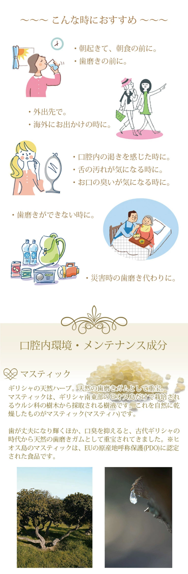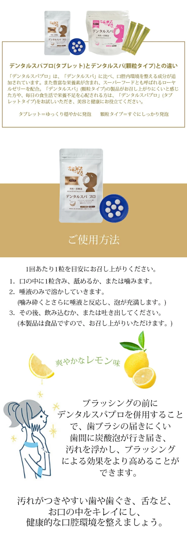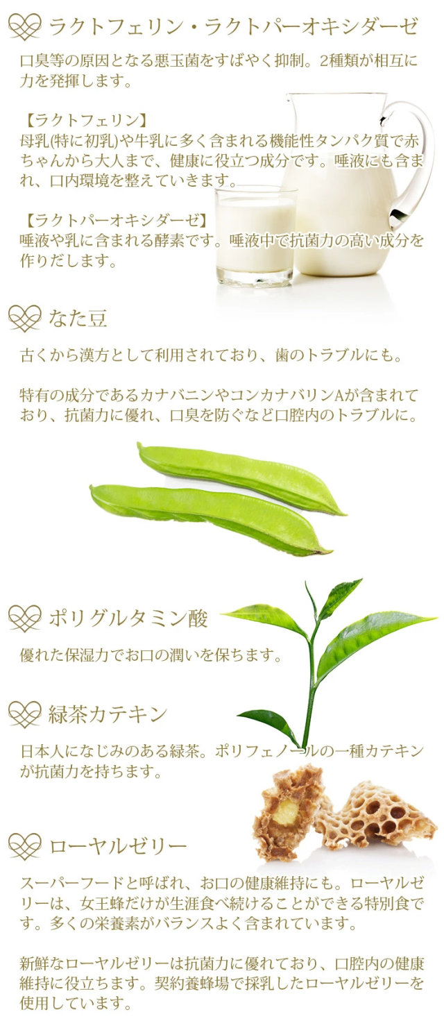 東洋炭酸研究所 デンタルスパプロ 60粒 ×2袋セット <2025年7月にリニューアルしました> ・緑茶カテキン、ナタマメエキスを増量 お口の中ですばやく溶けてお口の中をきれいにする炭酸発泡タブレット。顆粒タイプが苦手な方、一度に発泡せず、ゆっくり発泡してほしい方におすすめのタブレットタイプです。お子様や女性に好評。デンタルクリニック専用販売品がこのたび一般販売となりました。 <デンタルスパプロ(タブレット)とデンタルスパ(顆粒タイプ)との違い> 「デンタルスパプロ」は、「デンタルスパ」に比べ、口腔内環境を整える成分が追加されています。また豊富な栄養素が含まれ、スーパーフードとも呼ばれるローヤルゼリーを配合。「デンタルスパ」(顆粒タイプ)の製品がお召し上がりにくいと感じた方や、毎日の食生活で栄養不足を心配される方は、「デンタルスパプロ」(タブレットタイプ)をお試しいただき、美容と健康にお役立てください。 お口専用「炭酸パック」。炭酸発泡タブレットがお口の中で弾けて、クリアな口腔環境へと導きます。多くの人が歯周病や口臭に悩んでいます。ブラッシングの前にデンタルスパプロを併用することで、歯ブラシの届きにくい歯間に炭酸泡が行き届き、汚れを浮かし、ブラッシングによる効果をより高めることができます。汚れが付きやすい歯や歯ぐき、舌など、お口の中をキレイにし、健康的な口腔環境を整えましょう。 お口に1粒含むと、発泡し始め、炭酸泡が口の中に広がります。この泡が歯や歯周、舌の汚れを浮かしていきます。歯・口腔の健康は、全身疾患と深く関係しているといわれていますが、それだけでなく、食べる喜び、会話をする楽しみなど、精神的、社会的な健康にも大きく関わります。デンタルスパと毎日のブラッシングで、口腔環境を整えていきましょう。 <口腔に関するお悩みを大別すると6つに集中> ・歯ぐきが痩せてきた ・歯の色が悪くなった ・ドライマウスになった ・口臭が強くなった ・人に相談しづらい ・歯ぐきケアの仕方が分からない ※七星出版「プラチナーデ」編集部調べ <こんな時におすすめ> ・朝起きて、朝食の前に ・歯みがきの前に ・歯みがきできない時に ・外出先で ・災害時の歯みがき代わりに ・海外でおでかけの時に ・口腔内に乾きを感じた時に ・舌の汚れが気になる時に ・お口の臭いが気になる時に 〇マスティック ギリシャの伝統ハーブ。マスティック(マスティハ)は、ギリシャ南東部のヒオス島だけで栽培されるウルシ科の樹木から採取される樹液です。古代ギリシャ時代から歯が丈夫になり、口臭を抑えるなど、天然の歯磨きガムとして重宝されています。ヒオス島のマスティックは、EUの原産地呼称保護(PDO)に認定された食品です。 〇緑茶カテキン 日本人に馴染みのある緑茶。カテキンは、主に緑茶に多く含まれているポリフェノールの一種で、渋味や苦味のもととなる成分です。強い抗菌力があります。 〇なた豆 歯のトラブルに。古くから漢方でも利用されてきました。特有の成分であるカナバニンやコンカナバリンAが含まれています。 〇ラクトフェリン・ラクトパーオキシダーゼ 相互に力を発揮し口臭や歯周病の原因を抑制。 【ラクトフェリン】母乳(特に初乳)や牛乳に多く含まれるタンパク質で赤ちゃんから大人まで、健康に役立つ成分です。唾液にも含まれ、口腔環境を整えます。 【ラクトパーオキシダーゼ】唾液や乳に含まれる酵素です。唾液中で抗菌力の高い成分を作り出します。 〇ポリグルタミン酸 唾液は、口腔内の自浄、消化、咀嚼、嚥下補助など重要な働きをもっています。ポリグルタミン酸は、ヒアルロン酸やコラーゲンと同様に皮膚を保水性の高い皮膜で覆い、優れた保湿効果を発揮します。また、唾液の分泌を促すのでドライマウスの方などにもおすすめです。 〇ローヤルゼリー スーパーフードと呼ばれ、お口の健康維持にも。ローヤルゼリーは、女王蜂だけが生涯食べ続けることができる特別食です。多くの栄養素がバランスよく含まれています。新鮮なローヤルゼリーは抗菌力に優れており、口腔内の健康維持に役立ちます。契約養蜂場で採乳したローヤルゼリーを使用しています。 栄養成分表示 1個あたり エネルギー2.8kcal、たんぱく質0.001g、脂質0.002g、炭水化物0.7g、食塩相当量0.32g <使用期限について> パッケージに記載されています。 |