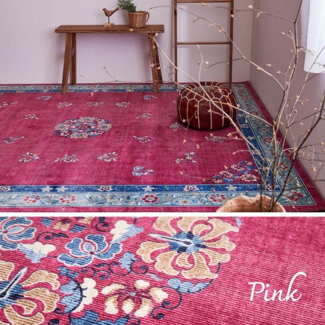 どこか東洋を感じさせるような花柄の絨毯風デザイン。その細やかなデザインを、転写プリントで美しく表現したなめらかフランネルラグ。
