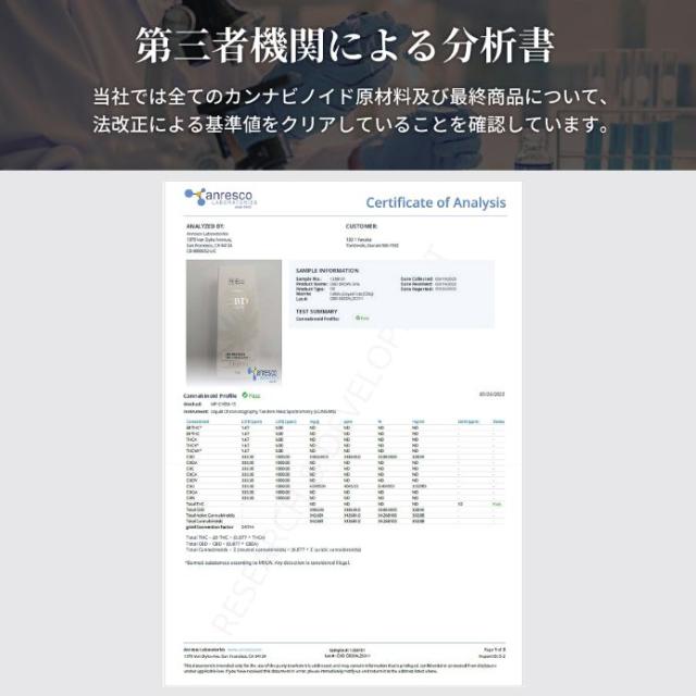 | 新基準適合 | 2024年12月12日施行された「大麻取締法及び麻薬及び向精神薬取締法の一部を改正する法律」により、CBD製品に含まれるTHCの残留値に新たな基準値が設けられました。現在、当社から販売しているすべてのカンナビノイド製品に関しましては、原材料の受け入れから最終製品の完成までに複数回の第三者機関による品質検査を実施しており、新基準値に適合していることを確認しております。これまで通り、高い品質の製品をお届けしてまいりますので、安心してご使用ください。 |