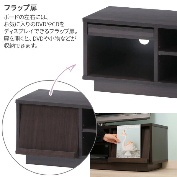 フラップ式扉を開くと、DVDや小物などの収納スペースに。