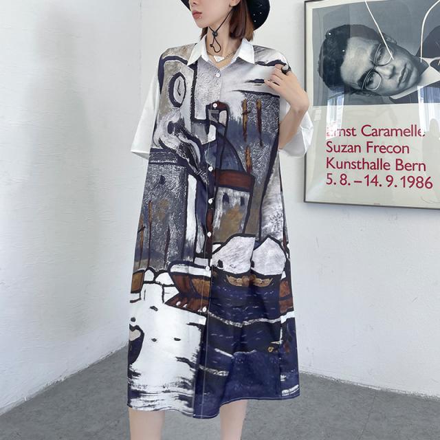 レトロチックな絵画風プリント柄の可愛いシャツワンピース。